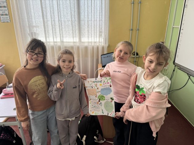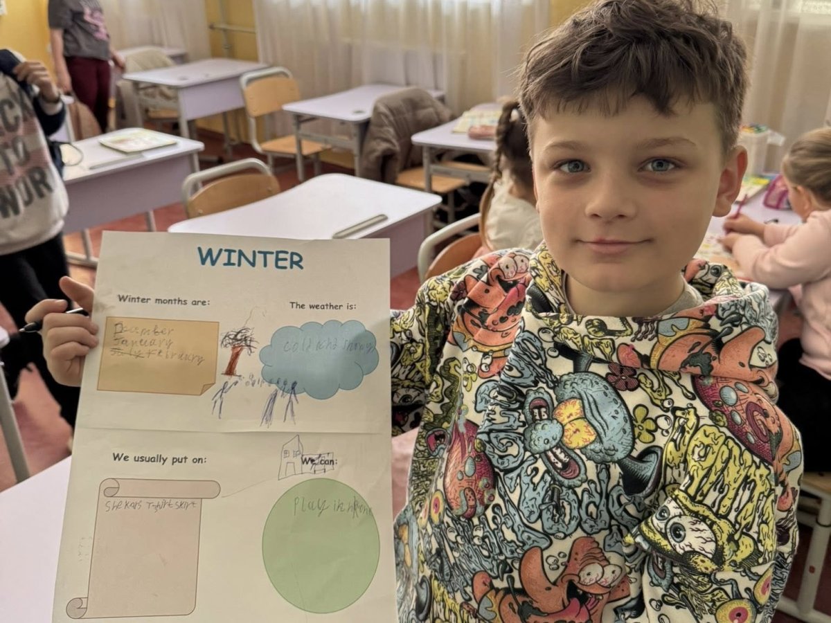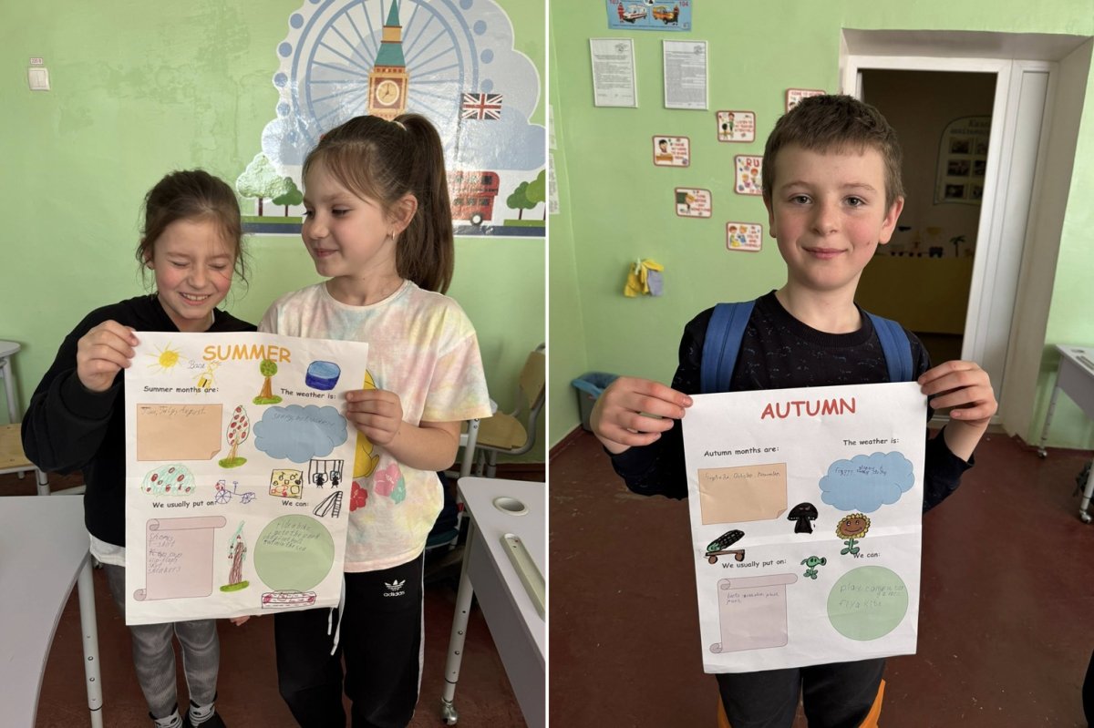 3-классники подхватили эстафету с популярной игрой с зонтиком. Крутили зонтик — и отвечали на вопрос «How’s the weather?» (Как погода?). Завершили тему основательной проектной работой. В группах ученики создавали яркие плакаты обо всех временах года: от названий месяцев и особенностей погоды до выбора гардероба и любимых развлечений.![]()