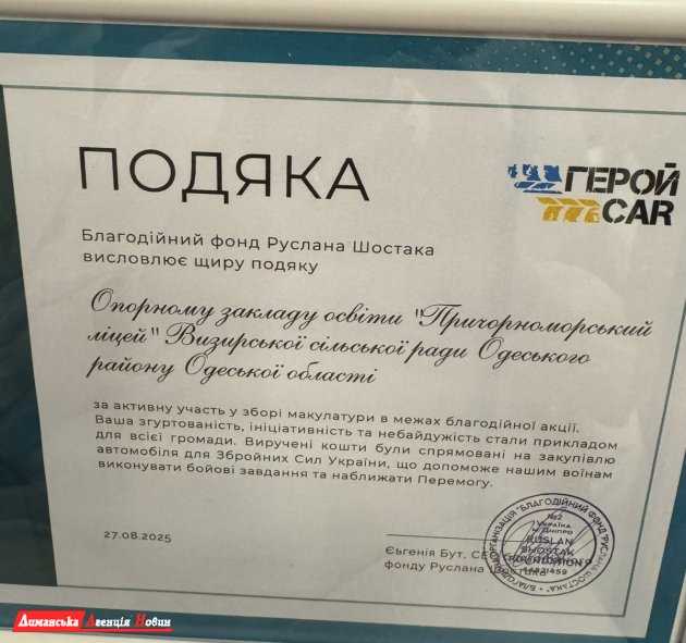 Причерноморскому лицею вручена грамота от благотворительного фонда Руслана Шостака за активное участие в сборе макулатуры, что позволило приобрести пикап для воинов 122 бригады и стало весомым вкладом в поддержку наших защитников.